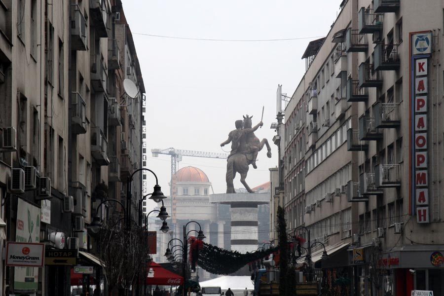 Υπερμεγέθη αγάλματα του Μεγάλου Αλεξάνδρου και του Φιλίππου Β’, του Τσόρτσιλ και της Μητέρας Τερέζας, της Ολυμπιάδας της Ηπείρου και του Τζορτζ Ουάσινγκτον, πελώρια μνημεία και ανακαινισμένα δημόσια κτήρια, γιγάντια σιντριβάνια και χρυσοποίκιλτες γέφυρες εν τω μέσω σοσιαλιστικού ύφους, άτονων και καταθλιπτικών συμπλεγμάτων πολυκατοικιών και βρόμικων δρόμων…