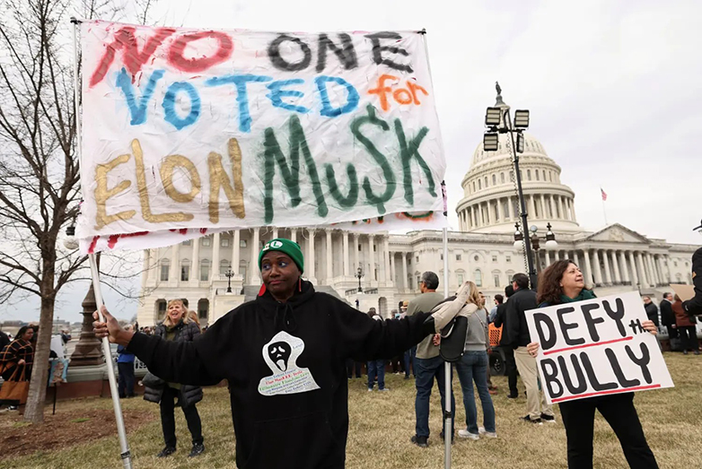 Συγκεντρώσεις έγιναν επίσης έξω από τις αντιπροσωπείες της Tesla, της βιομηχανίας ηλεκτρικών αυτοκινήτων του Ίλον Μασκ, του δισεκατομμυριούχου στον οποίο ανέθεσε ο πρόεδρος Τραμπ την εφαρμογή δραστικών μέτρων περιστολής των δημοσίων δαπανών και κλεισίματος ομοσπονδιακών υπηρεσιών.