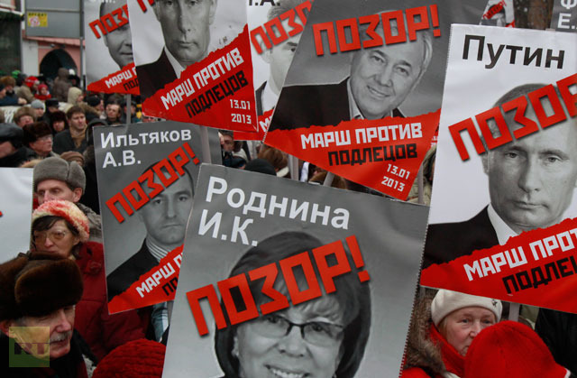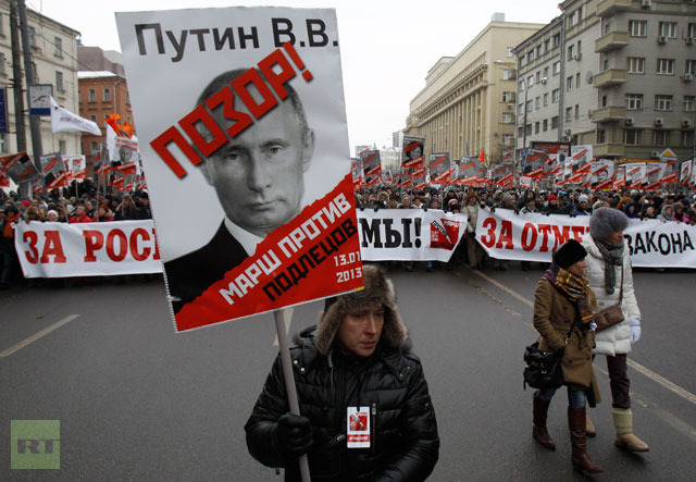 Οι διαδηλωτές κρατούσαν πανό με συνθήματα όπως «Ντροπή» και ζητούσαν την «ακύρωση του νόμου αυτού των δειλών». Επίσης φώναζαν συνθήματα όπως «Ρωσία χωρίς τον Πούτιν» ή «Πούτιν, κλέφτη!».