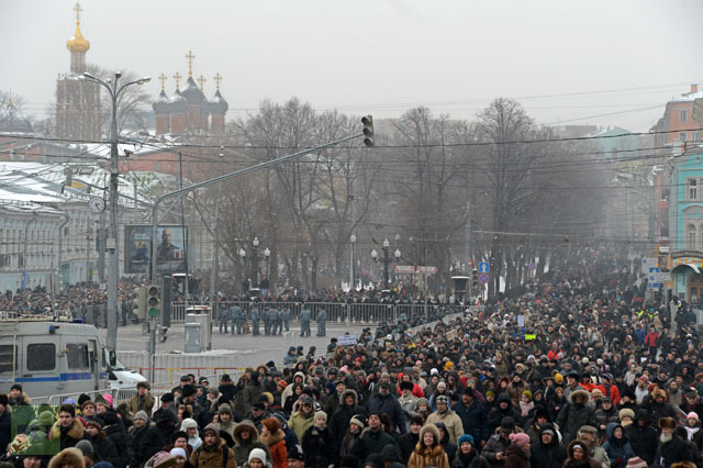 Περίπου 7.000 άνθρωποι, σύμφωνα με την αστυνομία, ή μεταξύ 30.000 και 50.000, σύμφωνα με τον Σεργκέι Ουντάλτσοφ, έναν από τους επικεφαλής της αντιπολίτευσης, η οποία είχε ζητήσει την πραγματοποίηση της διαδήλωσης, συγκεντρώθηκαν σήμερα στη Μόσχα, ενώ το θερμόμετρο είχε πέσει στους -13 βαθμούς Κελσίου.