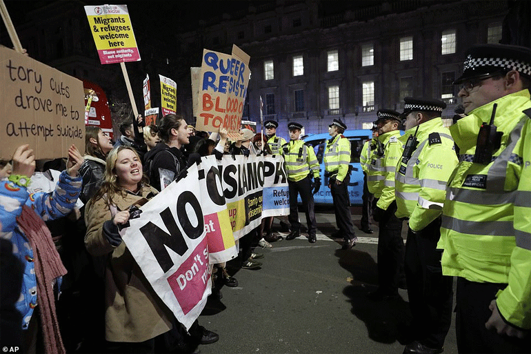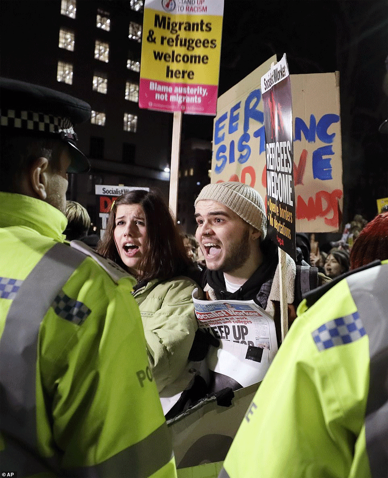 Οι διαδηλωτές κρατώντας πλακάτ που έγραφαν «Αψηφήστε την εξουσία των Τόρις» και «Ευπρόσδεκτοι οι πρόσφυγες» περπάτησαν με βήμα ταχύ από την πρωθυπουργική κατοικία στη Ντάουνινγκ Στριτ έως την πλατεία Τραφάλγκαρ μπλοκάροντας την κυκλοφορία υπό το βλέμμα μεγάλης αστυνομικής παρουσίας.