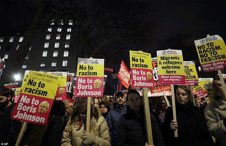 Εκατοντάδες διαδηλωτές πραγματοποίησαν πορεία στο κέντρο του Λονδίνου για να διαμαρτυρηθούν κατά του αποτελέσματος των βουλευτικών εκλογών τραγουδώντας «Μπόρις Τζόνσον: Δεν είναι ο πρωθυπουργός μου» και «Μπόρις, Μπόρις, Μπόρις, ‘Έξω, Έξω, Έξω».