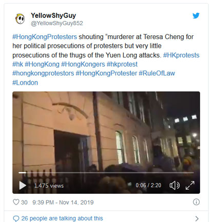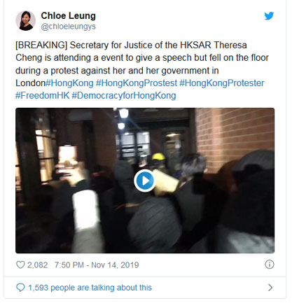 Επίθεση από διαδηλωτές δέχτηκε η υπουργός Δικαιοσύνης του Χονγκ Κονγκ, Τερέζα Τσενγκ, στο Λονδίνο, με αποτέλεσμα να υποστεί «σοβαρές σωματικές βλάβες».