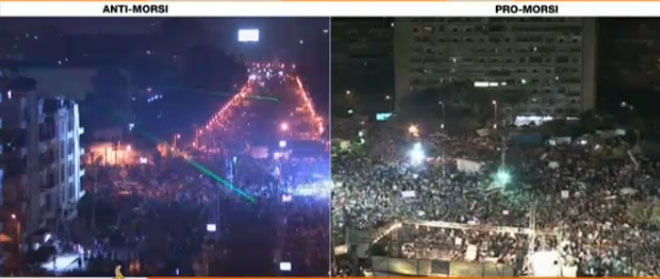 (Εικόνα του Al Jazeera – ώρα 3.00. Αριστερά οι αντικυβερνητικές διαδηλώσεις στην Ταχρίρ – Δεξιά οι διαδηλώσεις υπέρ του Αιγύπτιου προέδρου στο προάστιο Νασρ Σίτι)