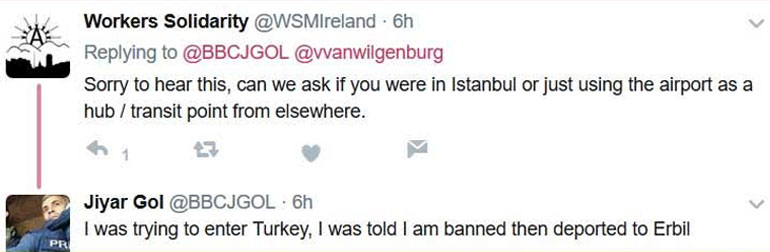«Χτες, κρατήθηκα στο αεροδρόμιο της Κωνσταντινούπολης, ερευνήθηκα, ανακρίθηκα και κατόπιν απελάθηκα, με αιτιολογικό τις ανταποκρίσεις μου στο BBC» έγραψε ο Jiyar Gol στον λογαριασμό του στο Twitter στις 30 Ιουνίου.