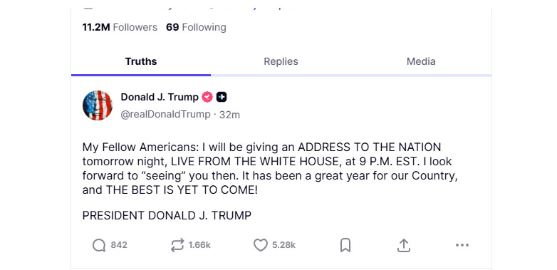 “Αμερικανοί συμπολίτες μου: θα απευθύνω διάγγελμα προς το έθνος αύριο το βράδυ, απευθείας από τον Λευκό Οίκο, στις 21.00”, έγραψε, προσθέτοντας: “Αυτή ήταν μια εξαιρετική χρονιά για τη χώρα μας και ΤΑ ΚΑΛΥΤΕΡΑ ΕΡΧΟΝΤΑΙ!”.