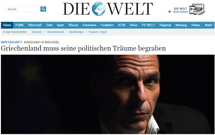 Το σχετικό δημοσίευμα της εφημερίδας «Die Welt» έχει τίτλο «Η Ελλάδα πρέπει να θάψει τα πολιτικά της όνειρα» και αναφέρεται σε «επικράτηση» του Βόλφγκανγκ Σόιμπλε.