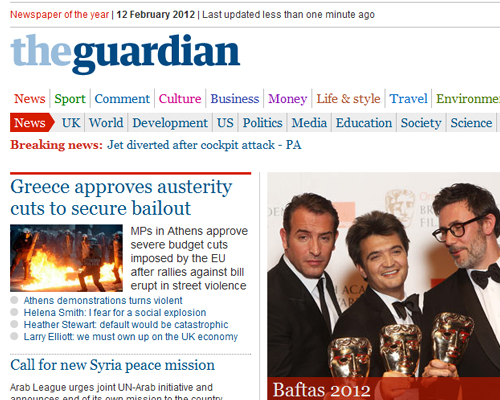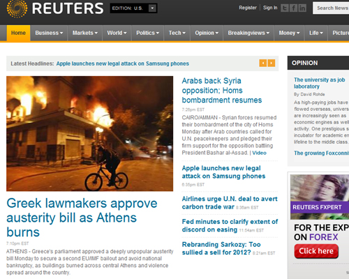 «Οι Έλληνες νομοθέτες ενέκριναν ένα πλάνο λιτότητας την ίδια στιγμή που η Αθήνα καιγόταν», επεσήμανε στον τίτλο του. «Το ελληνικό Κοινοβούλιο ενέκρινε ένα βαθύ αντιλαϊκό πακέτο λιτότητας τη Δευτέρα προκειμένου να διασφαλίσει ένα δεύτερο δάνειο από την Ευρωπαϊκή Ένωση και τη ΔΝΤ προκειμένου να αποφευχθεί η χρεοκοπία», πρόσθεσε.