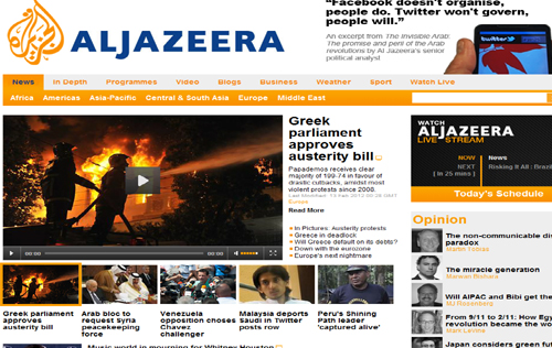 Πρώτη είδηση τα χθεσινά γεγονότα στην Αθήνα και στο αραβικό τηλεοπτικό δίκτυο Al Jazeera. Όπως εξήγησε «τα βίαια επεισόδια συνδέονται άμεσα με τη λαϊκή αντίδραση απέναντι στα νέα μέτρα λιτότητας που προωθεί η κυβέρνηση του Λουκά Παπαδήμου στο πλαίσιο εφαρμογής των συμφωνηθέντων με το Δ.Ν.Τ. για τη συνέχιση της χρηματοδότησης και την αποφυγή της χρεοκοπίας».
