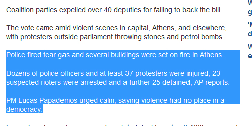 «Το ελληνικό κοινοβούλιο “πέρασε” ένα αμφιλεγόμενο πακέτο μέτρων λιτότητας που απαιτεί η Ευρωζώνη και το ΔΝΤ προκειμένου να εγκριθεί δάνειο συνολικού ύψους 130 δισ. ευρώ και να αποφευχθεί η χρεοκοπία», επεσήμανε στο κεντρικό του θέμα. Παράλληλα, υπογράμμισε πως «πάνω από 40 βουλευτές διεγράφησαν ύστερα από την απόφασή τους να μη στηρίξουν την κυβέρνηση του Λουκά Παπαδήμου».