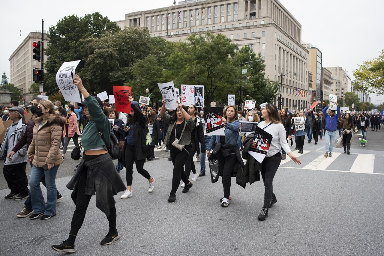 «Γυναίκες- Ζωή- Ελευθερία» είναι ένα από τα κεντρικά συνθήματα της εκδήλωσης. Οι διαδηλωτές κρατούν σημαίες του Ιράν και ανάβουν κεριά μπροστά στον Λευκό Οίκο. Όλο και πιο ξεκάθαρο είναι το αίτημα για καθεστωτική αλλαγή, ιδιαίτερα στην Ουάσιγκτον, όπου τις κινητοποιήσεις διοργανώνει η ιρανική διασπορά (Organization of Iranian American Communities, OIAC). Δεν είναι οι πρώτες εκδηλώσεις διαμαρτυρίας εναντίον του αναχρονιστικού καθεστώτος της Τεχεράνης, αλλά αυτή τη φορά όλα είναι διαφορετικά, επισημαίνει ο Αρέφ Αλβαντί, ένας από τους άνδρες που συμμετέχουν στην πορεία. «Νομίζω ότι αυτή τη φορά οι γυναίκες είναι στην πρωτοπορία», λέει. «Αυτή τη φορά οι γυναίκες κάνουν την επανάσταση. Είναι η ελπίδα μας για το μέλλον του Ιράν…».