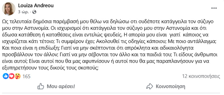 Μετά τον έντονο διαδικτυακό διάλογο που προκλήθηκε, η Λουΐζα Ανδρέου-Φαίδωνος προχώρησε σε ανάρτηση στο Facebook, διαψεύδοντας τους ισχυρισμούς και κάνοντας λόγο για «συντονισμένη επίθεση» με πολιτικά κίνητρα.