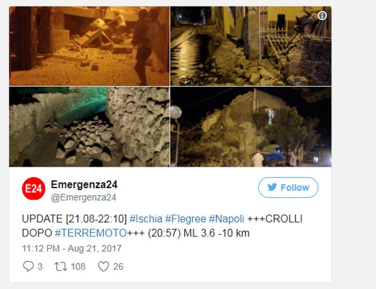 Δύο άνθρωποι έχασαν τη ζωή τους και δεκάδες τραυματίστηκαν από τον φονικό σεισμό μεγέθους 4 βαθμών της κλίμακας Ρίχτερ που σημειώθηκε ανοικτά του νησιού της Ίσκια, κοντά στη Νάπολη, το βράδυ της Δευτέρας. Παράλληλα, τουλάχιστον 10 άτομα αγνοούνται.