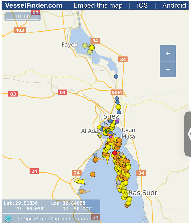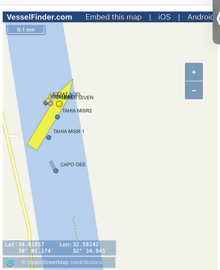 Δείτε στις παρακάτω φωτογραφίες τη θεση του cargo EVER GIVEN στη διώρυγα του Σουέζ όπως φαίνεται από τον δορυφόρο ένδειξης πλοίων.
