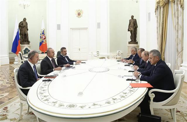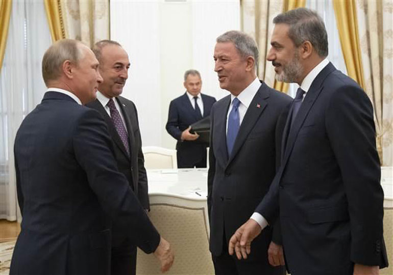 Όμως, το επίκεντρο της σημερινής ημέρας για την Τουρκία τοποθετείται αναμφισβήτητα στο Κρεμλίνο, όπου μια αναβαθμισμένη τουρκική αντιπροσωπεία από τον ΥΠΕΞ Μεχμέτ Τσαβούσγλου, τον Υπουργό Άμυνας και τον αρχηγό των μυστικών υπηρεσιών (ΜΙΤ) να γίνονται δεκτοί πρώτα από τον Σεργκέϊ Λαβρόφ και στη συνέχεια από τον ίδιο τον Βλαντιμίρ Πούτιν.