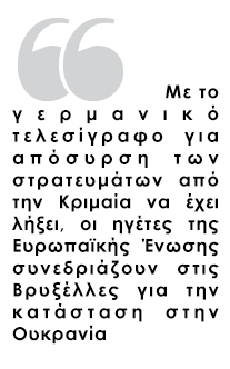 Στις 12.00 το μεσημέρι (ώρα Ελλάδας) αναμένεται να συνεδριάσουν οι ηγέτες των κρατών-μελών της Ε.Ε. στις Βρυξέλλες και με δεδομένη την προειδοποίηση του Βερολίνου για οικονομικά αντίποινα εάν οι Ρώσοι δεν κάνουν βήματα προς αποκλιμάκωση, η σύνοδος αποκτά ιδιαίτερο ενδιαφέρον.