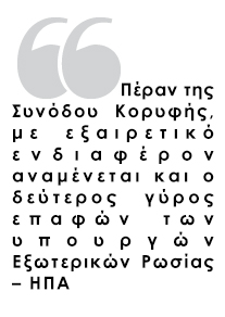 Πέραν της Συνόδου Κορυφής, με εξαιρετικό ενδιαφέρον αναμένεται και ο δεύτερος γύρος επαφών των υπουργών Εξωτερικών Ρωσίας – ΗΠΑ. Μετά τις άκαρπες διαπραγματεύσεις στο Παρίσι, Λαβρόφ και Κέρι συναντώνται εκ νέου στη Ρώμη, με τη Ρωσία να επιμένει πως βάση διαπραγμάτευσης είναι η συμφωνία της 21ης Φεβρουαρίου ανάμεσα στον έκπτωτο πρόεδρο Βίκτορ Γιανουκόβιτς και τους ηγέτες της τότε αντιπολίτευσης που τώρα βρίσκονται στην εξουσία στο Κίεβο.