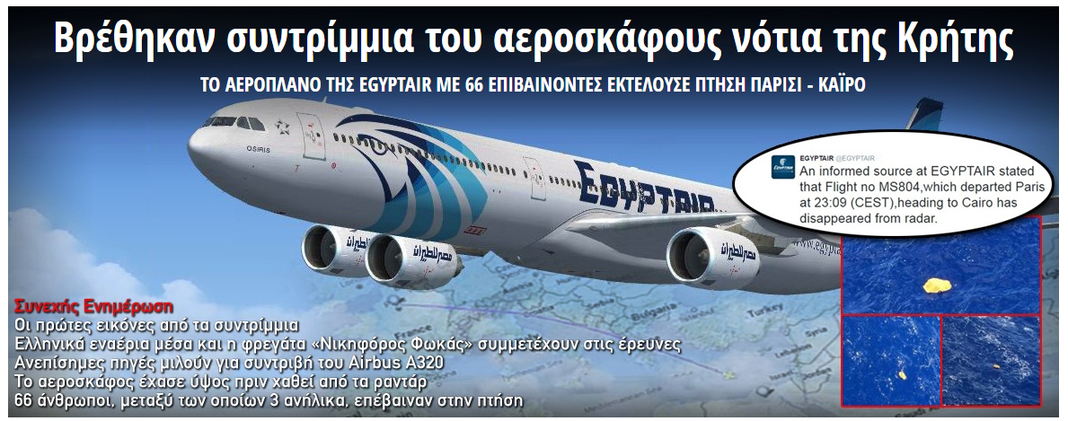 Η μοιραία πτήση MSR804 Παρίσι-Κάιρο της EgyptAir χάθηκε από τα ραντάρ τα ξημερώματα της Πέμπτης. Το Airfbus A320 που την εκτελούσε συνετρίβη νότια της ΚρήτηςΈπειτα από πολύωρες έρευνες, οι αιγυπτιακές Αρχές και η ιδιοκτήτρια εταιρία ανακοίνωσαν πως εντοπίστηκαν τα συντρίμμια και το κουφάρι του μοιραίου αεροσκάφους, κάτι που λίγες ώρες αργότερα φέρεται να διέψευσε ο αντιπρόεδρος της AigyprAir, σύμφωνα με δημοσίευμα του CNN. Τόσο η Ελλάδα με πλωτά και εναέρια μέσα όσο η Αίγυπτος και άλλες χώρες συμμετέχουν ενεργά τις τελευταίες ώρες για την εύρεση τυχόν επιζώντων.