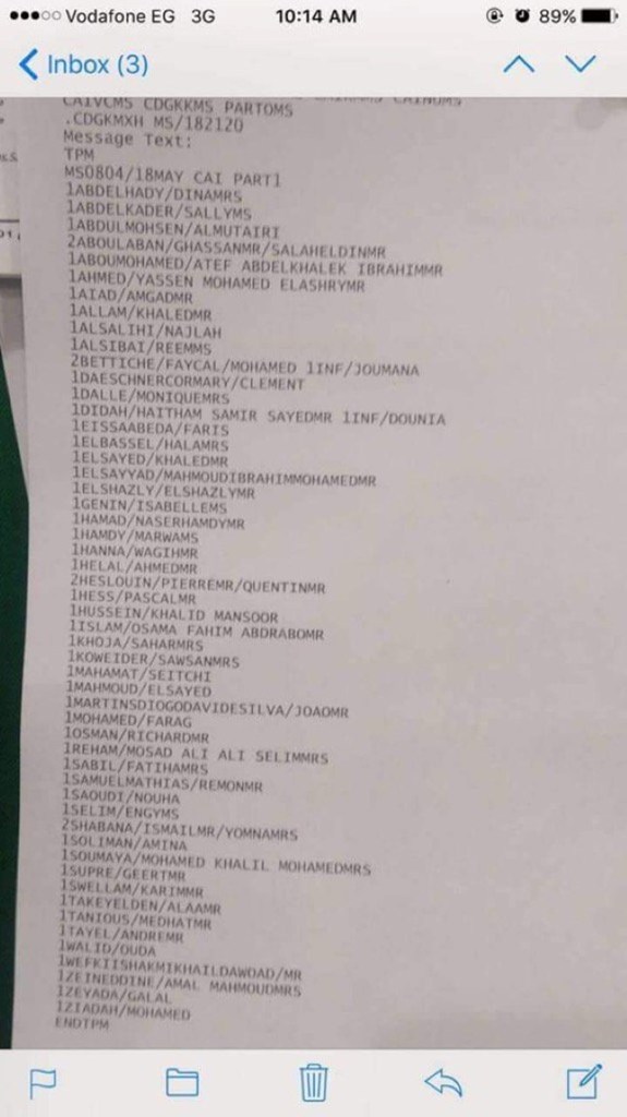 Στη δημοσιότητα δόθηκε και η λίστα με τους επιβάτες του μοιραίου Airbus της EgyptAir. Οι εθνικότητες των επιβατών που αγνοούνται είναι: