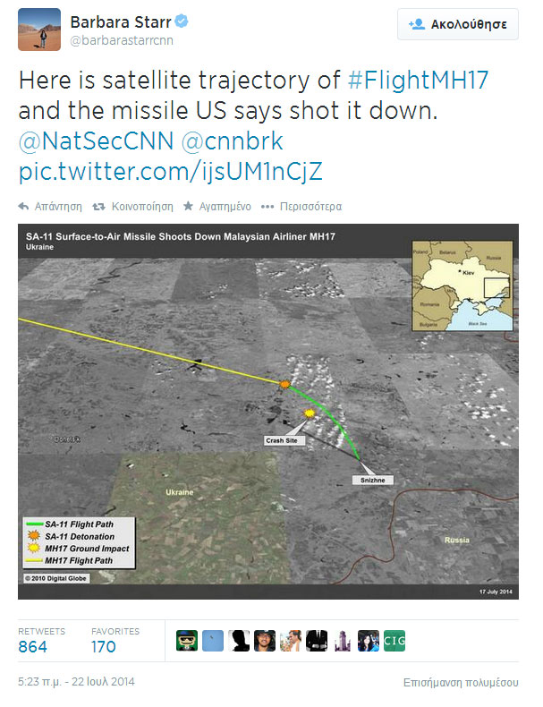 Το σχεδιάγραμμα της τροχιάς του αεροσκάφους δημοσιεύτηκε από το λογαριασμό της ανταποκρίτριας του τηλεοπτικού δικτύου στο Πεντάγωνο, Μπάρμπαρα Σταρ.