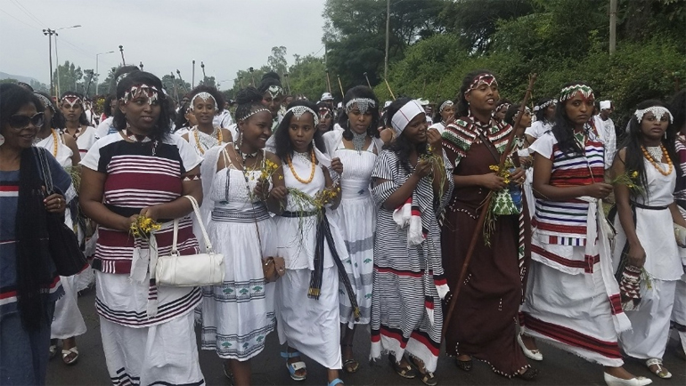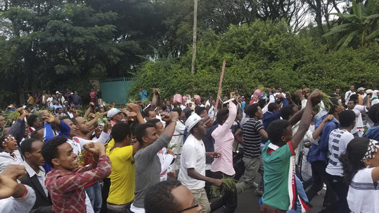 Πολλοί από τους συμμετέχοντες σταύρωσαν τα χέρια πάνω από το κεφάλι, μια χειρονομία η οποία έχει μετατραπεί σε σύμβολο της αμφισβήτησης από τους Ορόμο των αρχών της Αιθιοπίας, σύμφωνα με έναν φωτοειδησεογράφο του Γαλλικού Πρακτορείου.