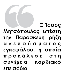 «Έφυγε» από τη ζωή σε ηλικία 49 ετών στις 1.30 το μεσημέρι του Σαββάτου ο υπουργός Άμυνας Τάσος Μητσόπουλος, έπειτα από ρήξη ανευρύσματος εγκεφάλου, η οποία προκάλεσε στη συνέχεια καρδιακό επεισόδιο. Στο πλευρό του μέχρι το τελευταίο λεπτό βρισκόταν η οικογένειά του, σύσσωμο το Υπουργικό Συμβούλιο, συνεργάτες, φίλοι, αρχηγοί και εκπρόσωποι κομμάτων.