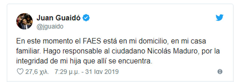 «Αυτή τη στιγμή οι FAES (ειδικές δυνάμεις) βρίσκονται στο σπίτι μου, στο σπίτι της οικογένειάς μου. Θέτω υπεύθυνο τον πολίτη Νικολάς Μαδούρο για την ακεραιότητα της κόρης μου που βρίσκεται εκεί» ανέφερε μέσω Twitter ο Χουάν Γκουαϊδό.