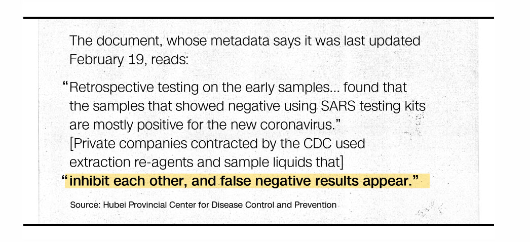 Στις 10 Φεβρουαρίου Κινέζοι αξιωματούχοι γνωστοποίησαν 2.478 νέα κρούσματα Covid-19, ανεβάζοντας τον συνολικό αριθμό των κρουσμάτων παγκοσμίως σε περισσότερα από 40.000. Όμως, με βάση έγγραφο με την ένδειξη «εσωτερικό έγγραφο, παρακαλώ διατηρήστε το απόρρητο», το CDC της Χουμπέι κατέγραφε 5.918 νέα κρούσματα, με 2.345 «επιβεβαιωμένα κρούσματα», 1.772 «κλινικά διαγνωσμένα κρούσματα» και 1.796 «ύποπτα κρούσματα».