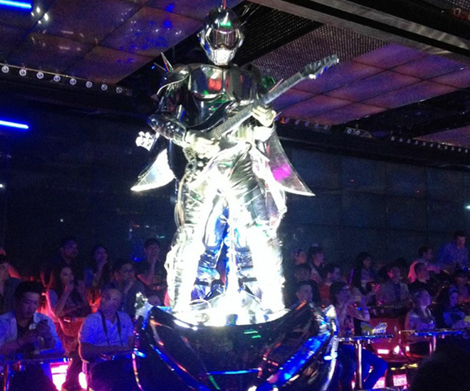Φαγητό, κοπέλες που χορεύουν –καθότι το μαγαζί θυμίζει κάτι και από καμπαρέ- ντυμένες με μεταλλικά… μαγιό, εκκωφαντική μουσική και φυσικά τα ρομπότ. Τα γιγάντια κατασκευάσματα χορεύουν, παλεύουν και χτυπούν γιγάντια τύμπανα, ξεκουφαίνοντας και τρελαίνοντας τους θαμώνες.