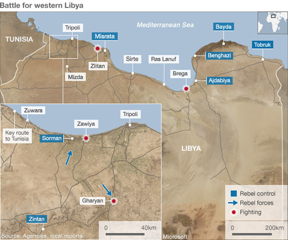 Σύμφωνα, πάντα, με το BBC, ισχυρές δυνάμεις που στέκονται στο πλευρό του Λίβυου συνταγματάρχη διατηρούν υπό τον έλεγχό τους τη στρατηγική σημασίας πόλη Brega, στην οποία βρίσκονται τα διυλιστήρια της χώρας αλλά και ο τερματικός αγωγός πετρελαίου.
