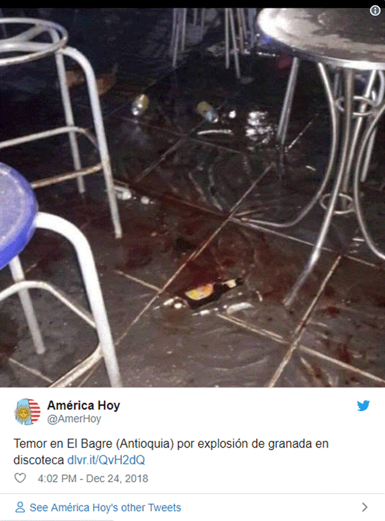 Τουλάχιστον 25 άνθρωποι τραυματίστηκαν σε έκρηξη σε ντίσκο στο βορειοανατολικό τμήμα της περιοχής Ελ Μπάγκρε της Κολομβίας.