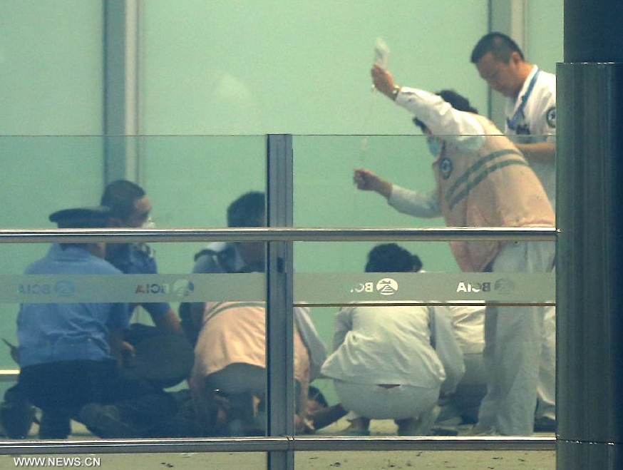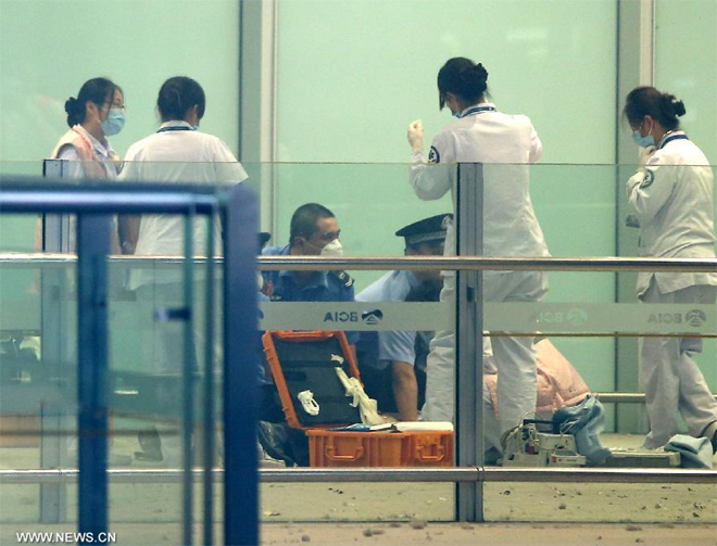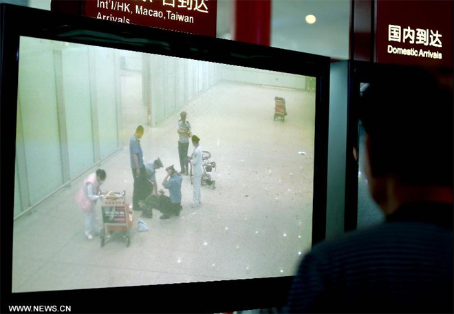 Το μπλογκ Sina Weibo της κρατικής ραδιοτηλεόρασης China Central Television ανέφερε πως ένας άνδρας πυροδότησε ένα δέμα μαύρης πυρίτιδας που χρησιμοποιείται για την κατασκευή κροτίδων ακριβώς έξω από την έξοδο των διεθνών αφίξεων.