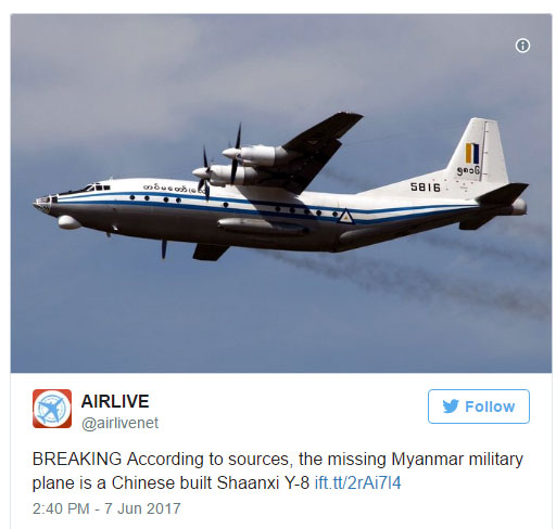 Το στίγμα του αεροπλάνου, που σύμφωνα με πηγές είναι ένα κινέζικο Shaanxi Y-8, χάθηκε μεταξύ Myeik και Yangoon. Αποστολή έρευνας και διάσωσης έχει ξεκινήσει έρευνες, ενώ πιστεύεται ότι επιβάτες ήταν οι συγγενείς του στρατιωτικού προσωπικού με βάση την ακτογραμμή. «Πιστεύουμε ότι ήταν τεχνική βλάβη», δήλωσε πηγή που δεν θέλησε να κατονομαστεί στο AFP, τονίζοντας πως οι καιρικές συνθήκες ήταν καλές.