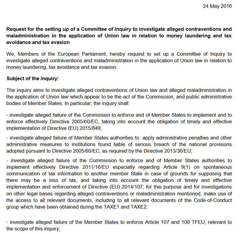 Το ΕΚ συμφώνησε στις 8 Ιουνίου στη σύσταση εξεταστικής επιτροπής για να διερευνήσει τις αποκαλύψεις των «Panama Papers». Η επιτροπή αυτή πρόκειται να διερευνήσει τις καταγγελλόμενες παραβιάσεις και την κακοδιοίκηση κατά την εφαρμογή από την Επιτροπή ή από τα κράτη μέλη της κοινοτικής νομοθεσίας για το ξέπλυμα χρήματος, τη φοροδιαφυγή και τη φοροαποφυγή. Θα έχει στη διάθεσή της 12 μήνες για να συντάξει την έκθεσή της.