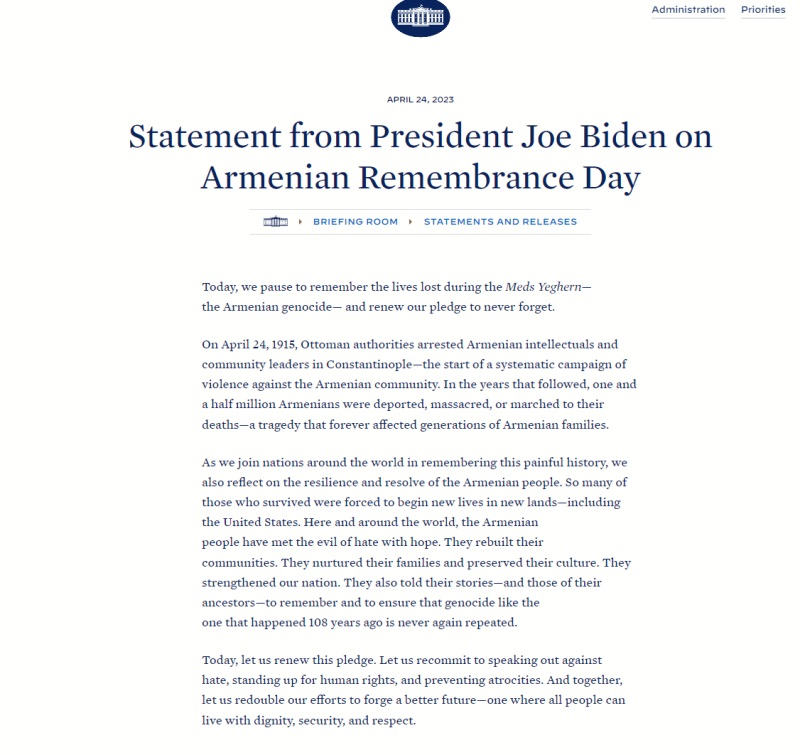 «Σήμερα, κάνουμε μια παύση για να θυμηθούμε τις ζωές που χάθηκαν κατά τη διάρκεια του Meds Yeghern – της γενοκτονίας των Αρμενίων – και ανανεώνουμε την υπόσχεσή μας να μην ξεχάσουμε ποτέ.