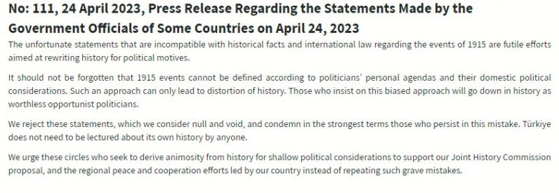 «Οι ατυχείς δηλώσεις για τα γεγονότα του 1915 που είναι ασύμβατες με την πραγματικότητα και το διεθνές δίκαιο είναι μάταιες προσπάθειες να ξαναγραφτεί η ιστορία με πολιτικά κίνητρα.