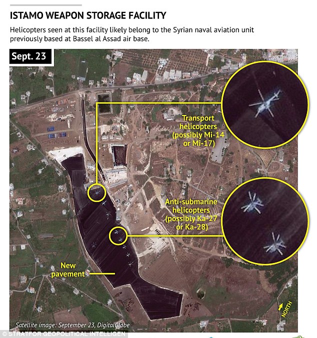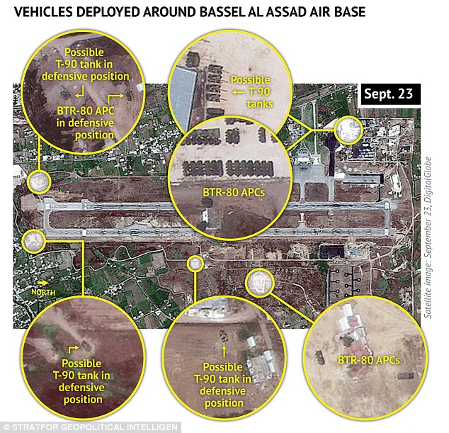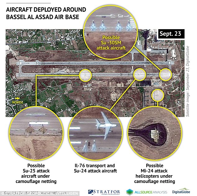 Πάντως, δεδομένα από δορυφορικές φωτογραφίες αποδεικνύουν πως κατά τις τελευταίες εβδομάδες η Μόσχα έχει τοποθετήσει στη Συρία, κοντά στη βορειοδυτική πόλη της Λατάκιας, περισσότερα από 24 μαχητικά αεροσκάφη και από 20 πολεμικά ελικόπτερα, πυραύλους εδάφους-αέρος, άρματα μάχης, οχήματα μεταφοράς προσωπικού και καταλύματα για τη στέγαση περίπου 2.000 ανδρών.