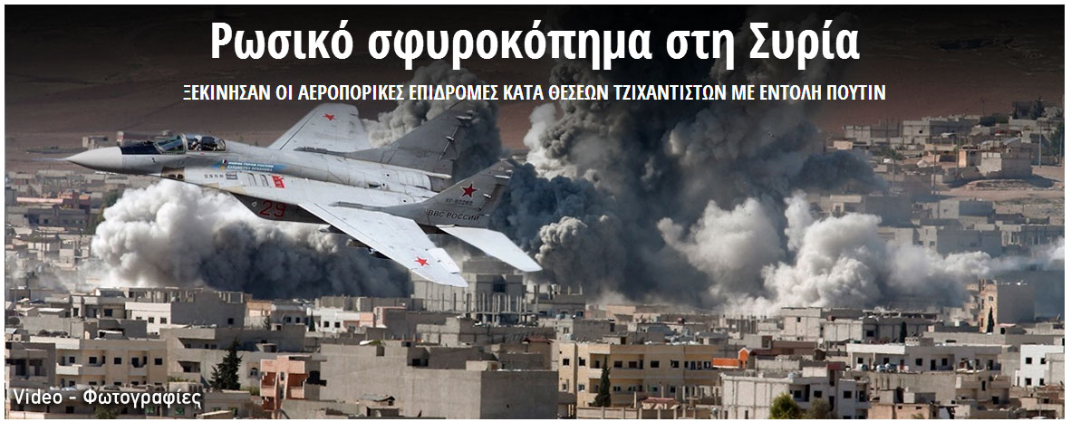 Η στρατιωτική εμπλοκή της Ρωσίας στη συριακή κρίση είναι πλέον γεγονός. Λίγες ώρες μετά το «πράσινο φως» που έδωσε η Άνω Βουλή της χώρας για την αποστολή στρατευμάτων προς υποστήριξη των δυνάμεων του καθεστώτος Άσαντ στη μάχη με το Ισλαμικό Χαλιφάτο, η Μόσχα προειδοποίησε την Ουάσινγκτον να μην πραγματοποιήσει πτήσεις αμερικανικών αεροσκαφών και στη συνέχεια εξαπέλυσε αεροπορικές επιδρομές στις επαρχίες Χομς και Χάμα της Συρίας.