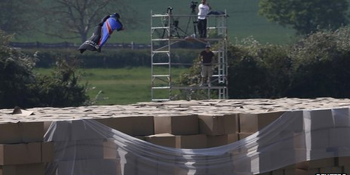 Ερασιτεχνική κάμερα κατέγραψε απίστευτες εικόνες, με τον Gary Connery να… προσγειώνεται με ασφάλεια μέσα στην ειδικά διαμορφωμένη πλατφόρμα από χαρτοκιβώτια, συνολικής έκτασης 100 x 15 μ. έχοντας προηγουμένως φτάσει σε ταχύτητα ακόμα και τα 80 χλμ./ώρα.