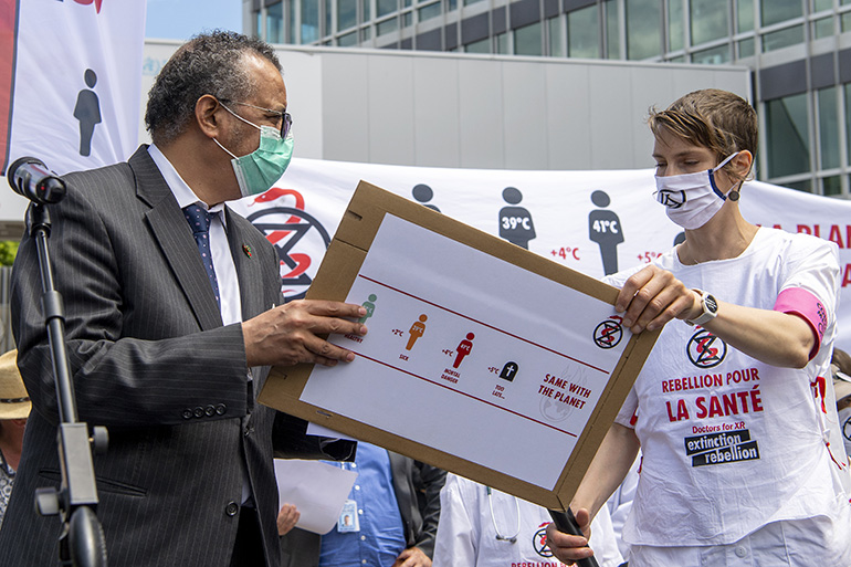 Μόλις έφτασαν μπροστά από το κτήριο του Π.Ο.Υ., εκπρόσωποι του δικτύου ακτιβιστών για το κλίμα Doctors for Extinction Rebellion (Doctors4XR) παρέδωσαν μια λίστα υπογραφών στον γενικό διευθυντή του Π.Ο.Υ. Τέντρος Αντανόμ Γκεμπρεγέσους.