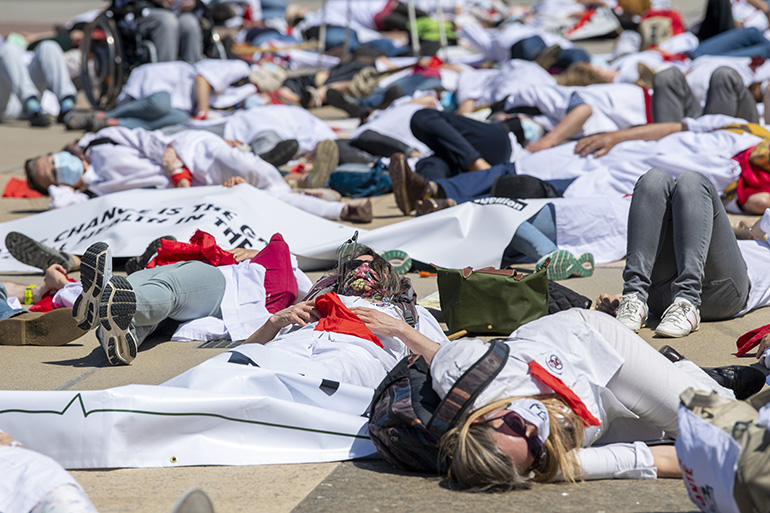 Περίπου 200 επαγγελματίες υγείας διαδήλωσαν σήμερα, Σάββατο, μπροστά από το κτήριο του Παγκόσμιου Οργανισμού Υγείας στη Γενεύη, για να ζητήσουν οι Αρχές όλων των χωρών να αναγνωρίσουν τους υγειονομικούς κινδύνους που συνδέονται με την κλιματική αλλαγή και να ενεργήσουν για την αντιμετώπισή τους.