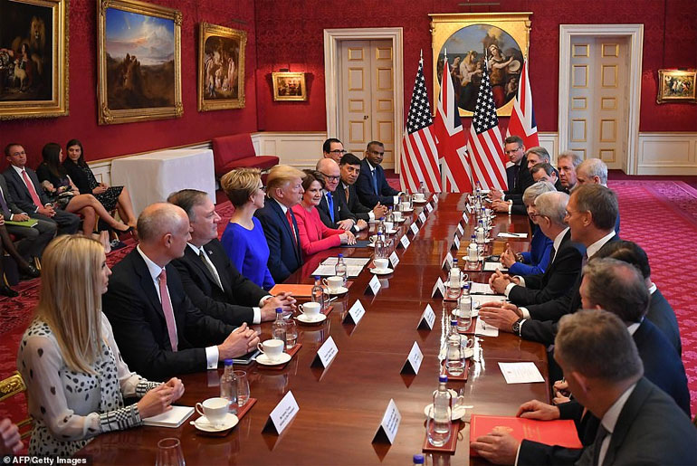 Το πρωί οι δύο ηγέτες πήραν πρωινό σε αίθουσα του παλατιού St. James, πολύ κοντά στην Downing Street, στην οποία ο κ. Τραμπ μεταφέρθηκε με ελικόπτερο από την αμερικανική πρεσβεία όπου διαμένει.