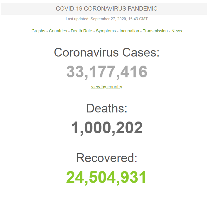 Η πανδημία του νέου κορωνοϊού έχει στοιχίσει τη ζωή σε 1 εκατομμύριο ανθρώπους σε ολόκληρο τον κόσμο, από τότε που το γραφείο του Παγκόσμιου Οργανισμού Υγείας στην Κίνα έκανε λόγο για την εμφάνιση της νόσου Covid-19 στα τέλη Δεκεμβρίου, σύμφωνα με την καταμέτρηση της ιστοσελίδας “Worldometer” που συλλέγει στοιχεία από επίσημες ενημερώσεις κυβερνητικών ιστοτόπων.