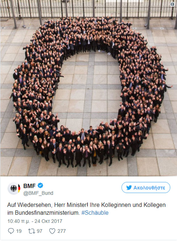 Σχεδόν 400 εργαζόμενοι και συνεργάτες του, ντυμένοι στα μαύρα, σχημάτισαν ένα μεγάλο ανθρώπινο «μηδέν», θέλοντας να τιμήσουν με αυτόν τον τρόπο το επίτευγμα του Βόλφγκανγκ Σόιμπλε να ισοσκελίσει τον ομοσπονδιακό προϋπολογισμό.