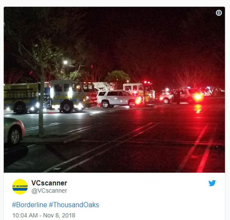 Με τρία καπνογόνα και ένα αυτόματο όπλο άγνωστος εισήλθε σε μπαρ στην πόλη Thousand Oaks στην Καλιφόρνια και έριξε τουλάχιστον 30 σφαίρες. Σύμφωνα με τον σερίφη της κομητείας της Βεντούρα, 11 άνθρωποι σκοτώθηκαν, ενώ υπάρχουν αναφορές για τουλάχιστον 20 τραυματίες.