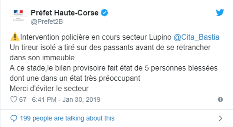 Ένας 60χρονος άνοιξε πυρ στη μέση ενός δρόμου, στην Μπαστιά της Κορσικής το απόγευμα της Τετάρτης σκοτώνοντας τουλάχιστον έναν άνθρωπο και τραυματίζοντας ακόμη έξι, εκ των οποίων και έναν αστυνομικό, πριν ταμπουρωθεί στο σπίτι του, ανέφεραν αστυνομικές πηγές.