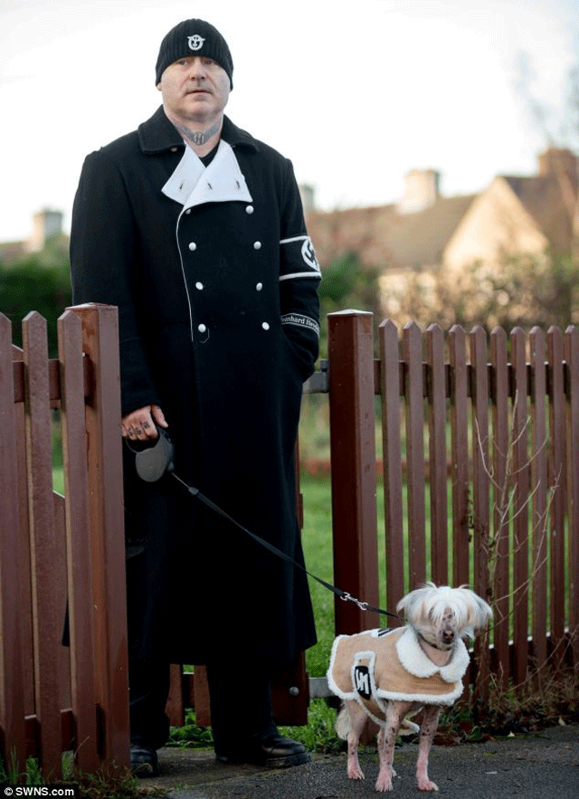 Τώρα επανέρχεται ντύνοντας τον σκύλο του με στολή που έχει πάνω τη σβάστικα και ένα από τα «logo» των SS.