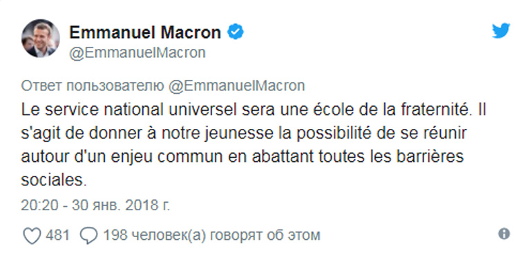 Ο κ. Μακρόν σε ανάρτησή του στο Twitter τον προηγούμενο μήνα ανέφερε: «Η εθνική υποχρεωτική θητεία θα είναι ένα σχολείο “αδελφότητας”. Πρόκειται για μία ευκαιρία για τη νεολαία μας να έρθει κοντά για έναν κοινό σκοπό, υπερβαίνοντας όλα τα κοινωνικά εμπόδια».
