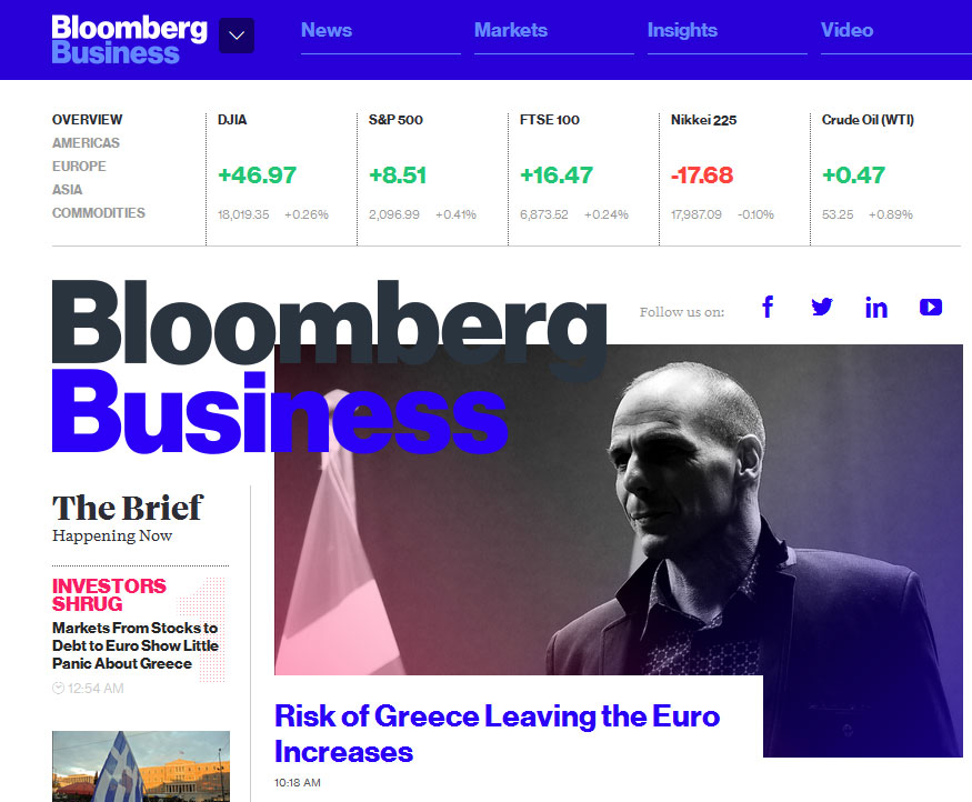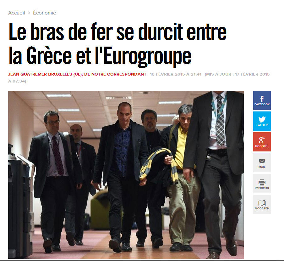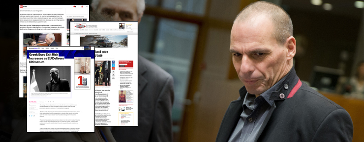 «Η Ελλάδα απειλείται με έξοδο από την Ευρωζώνη. Μετά από μία χαοτική συνεδρίαση, οι υπουργοί Οικονομικών της Ευρωζώνης έθεσαν στην Αθήνα ένα τελεσίγραφο. Η νέα κυβέρνηση, υπό τον Αριστερό πρωθυπουργό Αλέξη Τσίπρα, έχει χρόνο μέχρι την Τετάρτη για να ζητήσει την παράταση του προγράμματος που λήγει στις 28 Φεβρουαρίου».