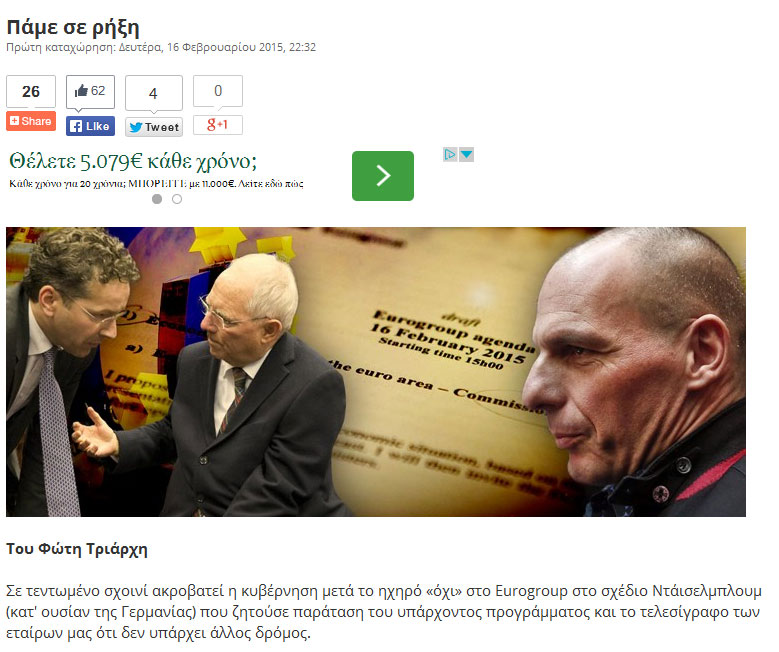 «Η Ελλάδα απειλείται με έξοδο από την Ευρωζώνη. Μετά από μία χαοτική συνεδρίαση, οι υπουργοί Οικονομικών της Ευρωζώνης έθεσαν στην Αθήνα ένα τελεσίγραφο. Η νέα κυβέρνηση, υπό τον Αριστερό πρωθυπουργό Αλέξη Τσίπρα, έχει χρόνο μέχρι την Τετάρτη για να ζητήσει την παράταση του προγράμματος που λήγει στις 28 Φεβρουαρίου».